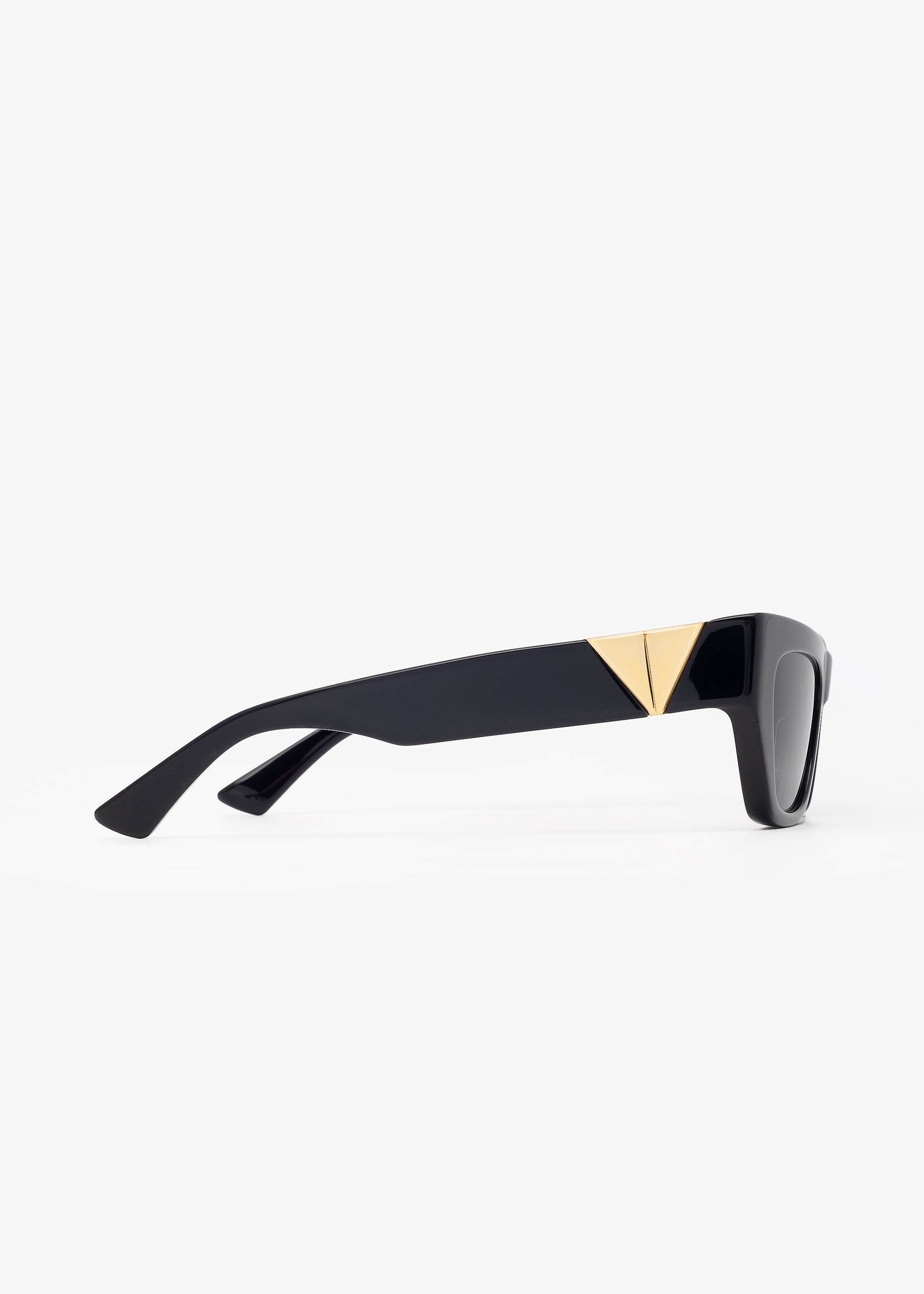 Montatura femminile cat-eye interamente in acetato, caratterizzata da volumi definiti e audaci. Nuova cerniera dedicata triangolare in metallo. Logo Bottega Veneta sulla parte superiore della cerniera.