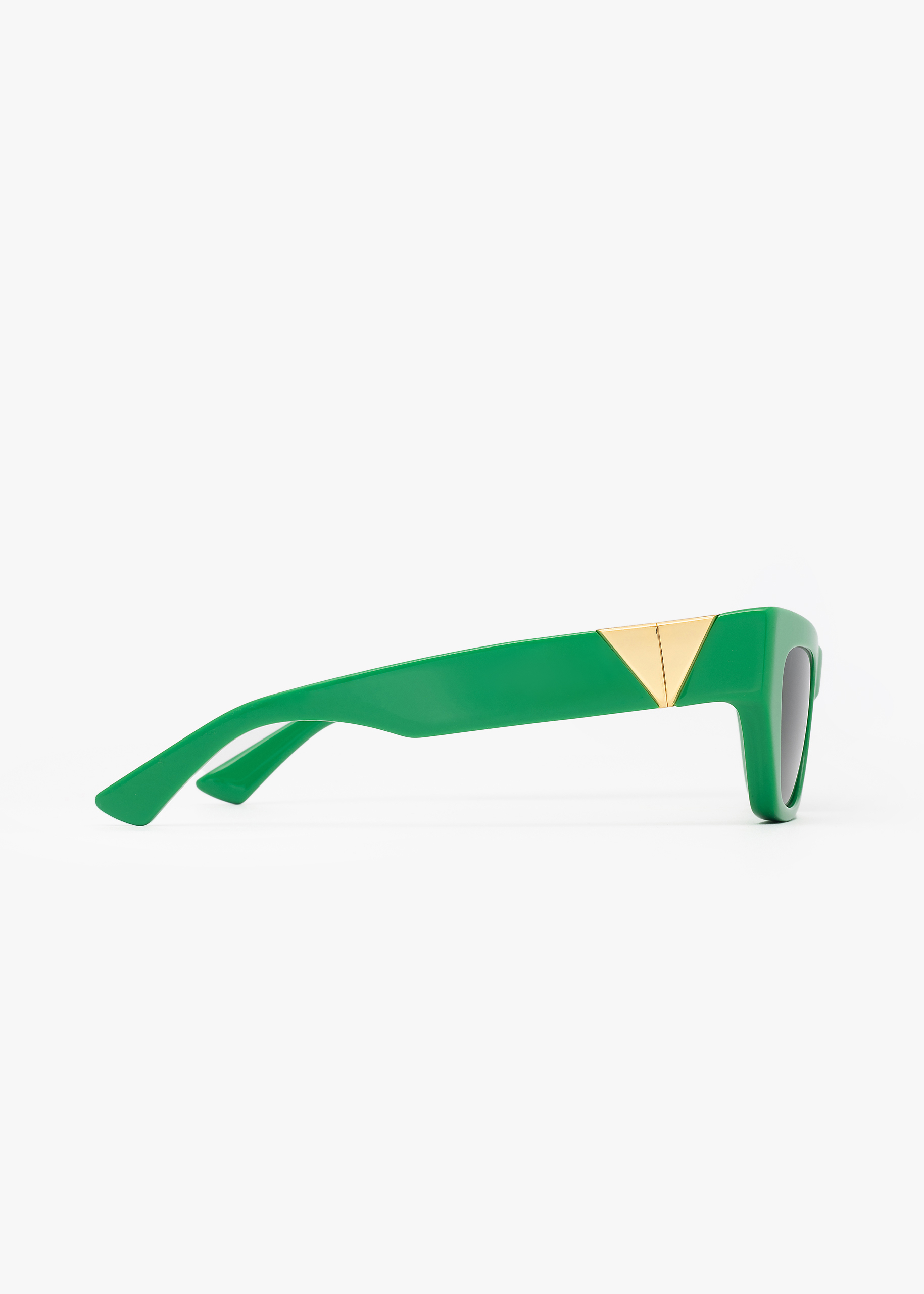Montatura femminile cat-eye interamente in acetato, caratterizzata da volumi definiti e audaci. Nuova cerniera dedicata triangolare in metallo. Logo Bottega Veneta sulla parte superiore della cerniera.