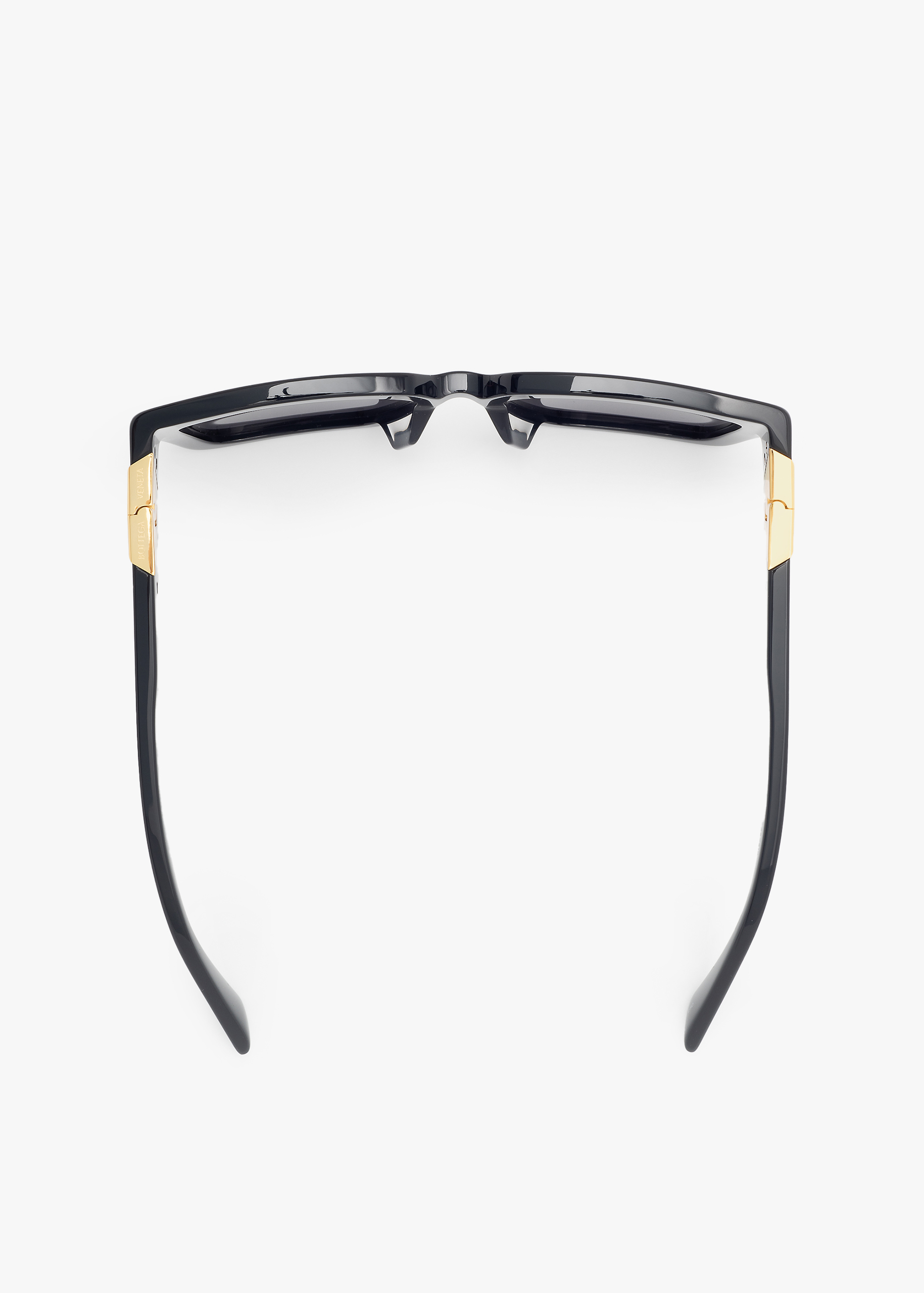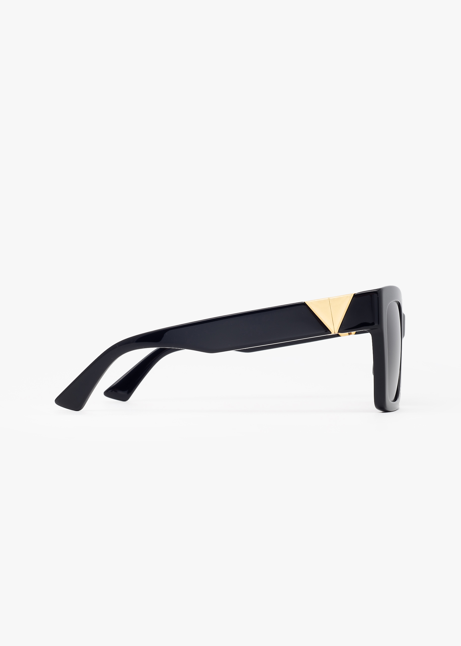 Ampia montatura femminile dalla forma rettangolare interamente in acetato, caratterizzata da volumi definiti e audaci. Nuova cerniera dedicata triangolare in metallo. Logo Bottega Veneta sulla parte superiore della cerniera. Aste più leggere e sottili per declinazione AF.