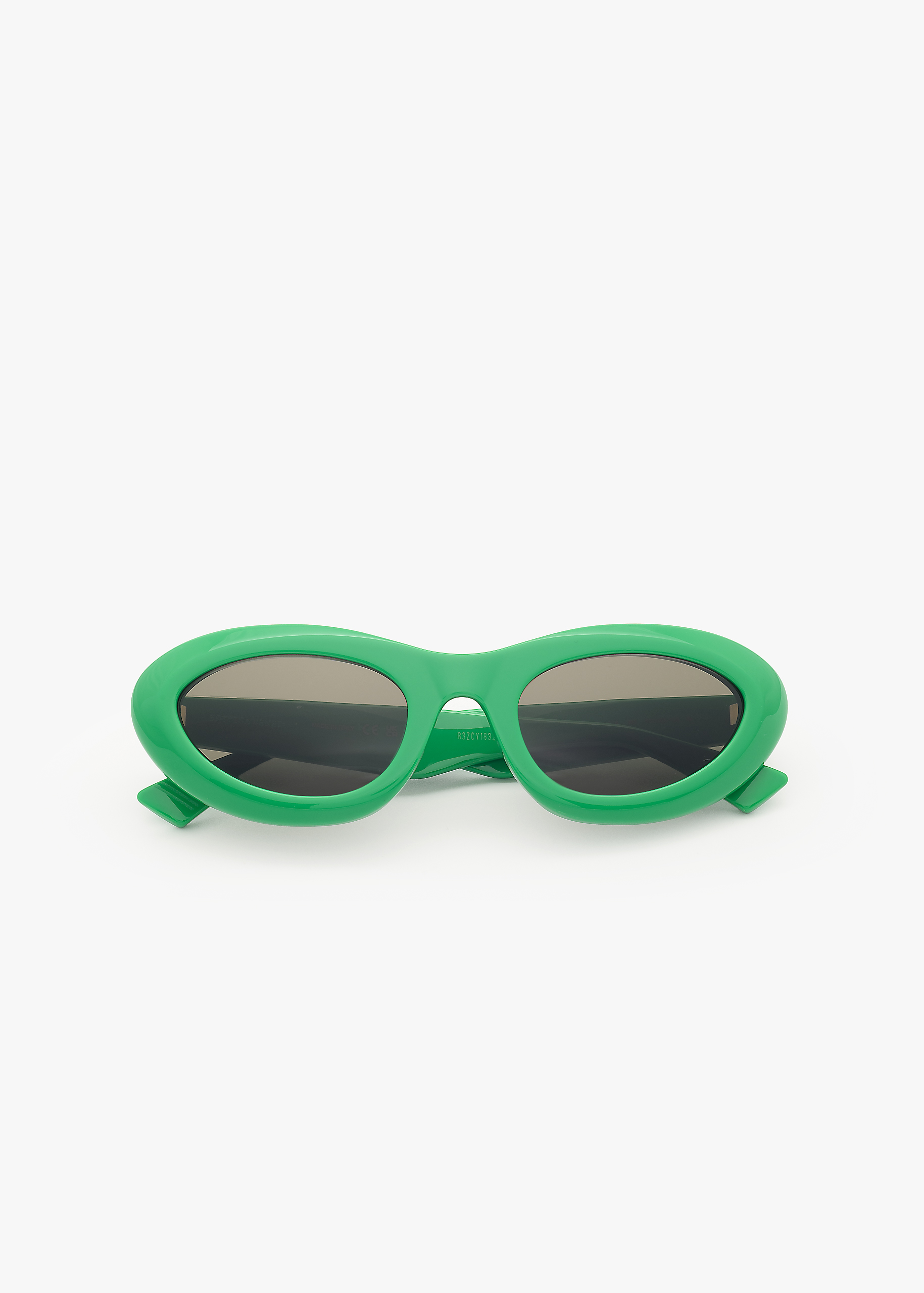 Montatura femminile a mandorla interamente in acetato, caratterizzata da volumi definiti e audaci. Aste geometriche impreziosite dall’iconico motivo a strisce in metallo. Logo Bottega Veneta sulla parte superiore dell’asta.