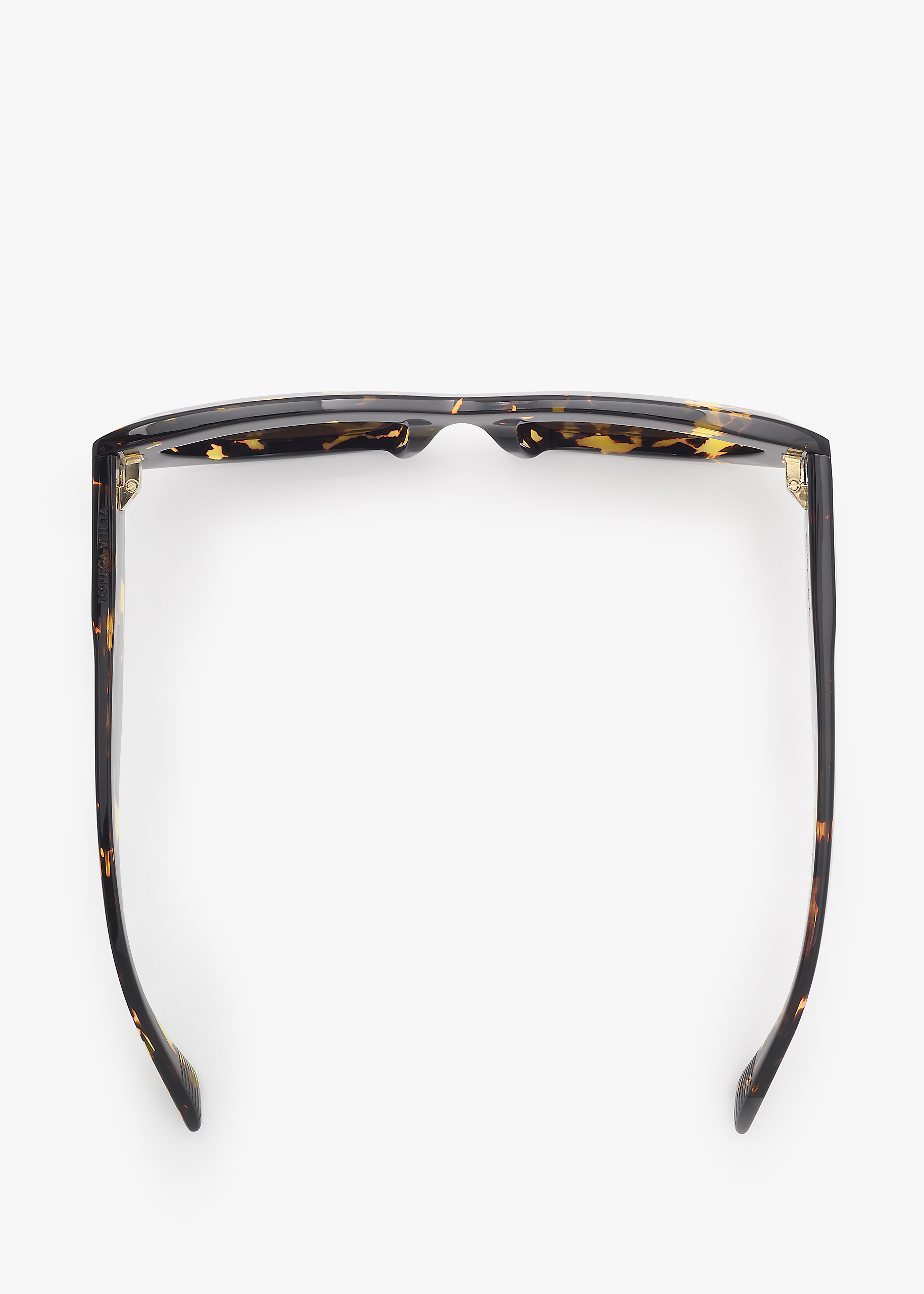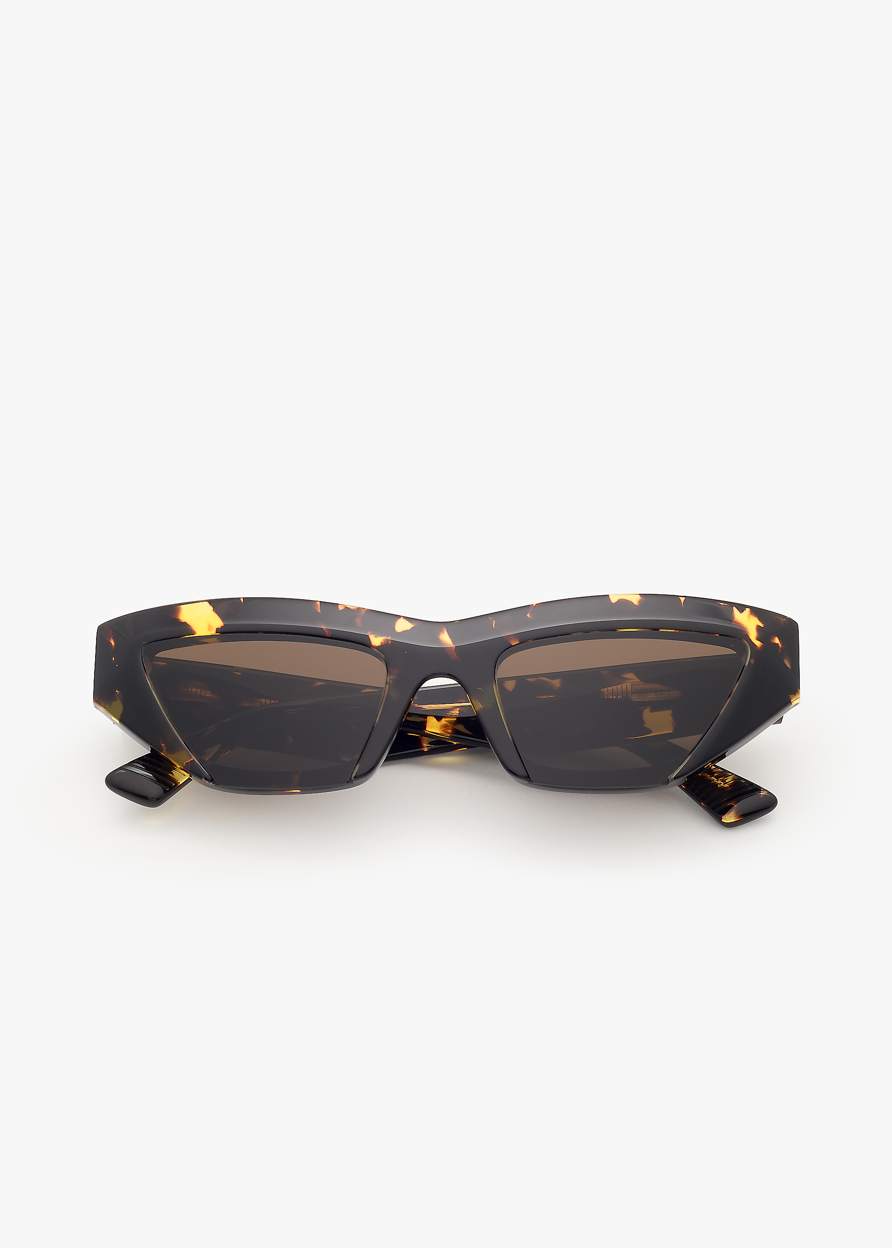 Montatura femminile cat-eye stretta interamente in acetato, caratterizzata da profili sfaccettati. Frontale e aste con sfaccettature triangolari. Lenti flash per un effetto ancora più ricco. Iconico motivo a strisce in metallo sull’asta.