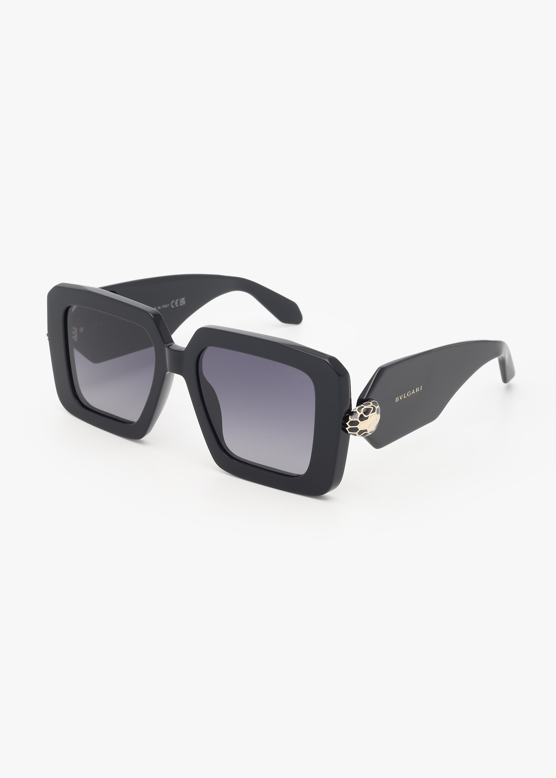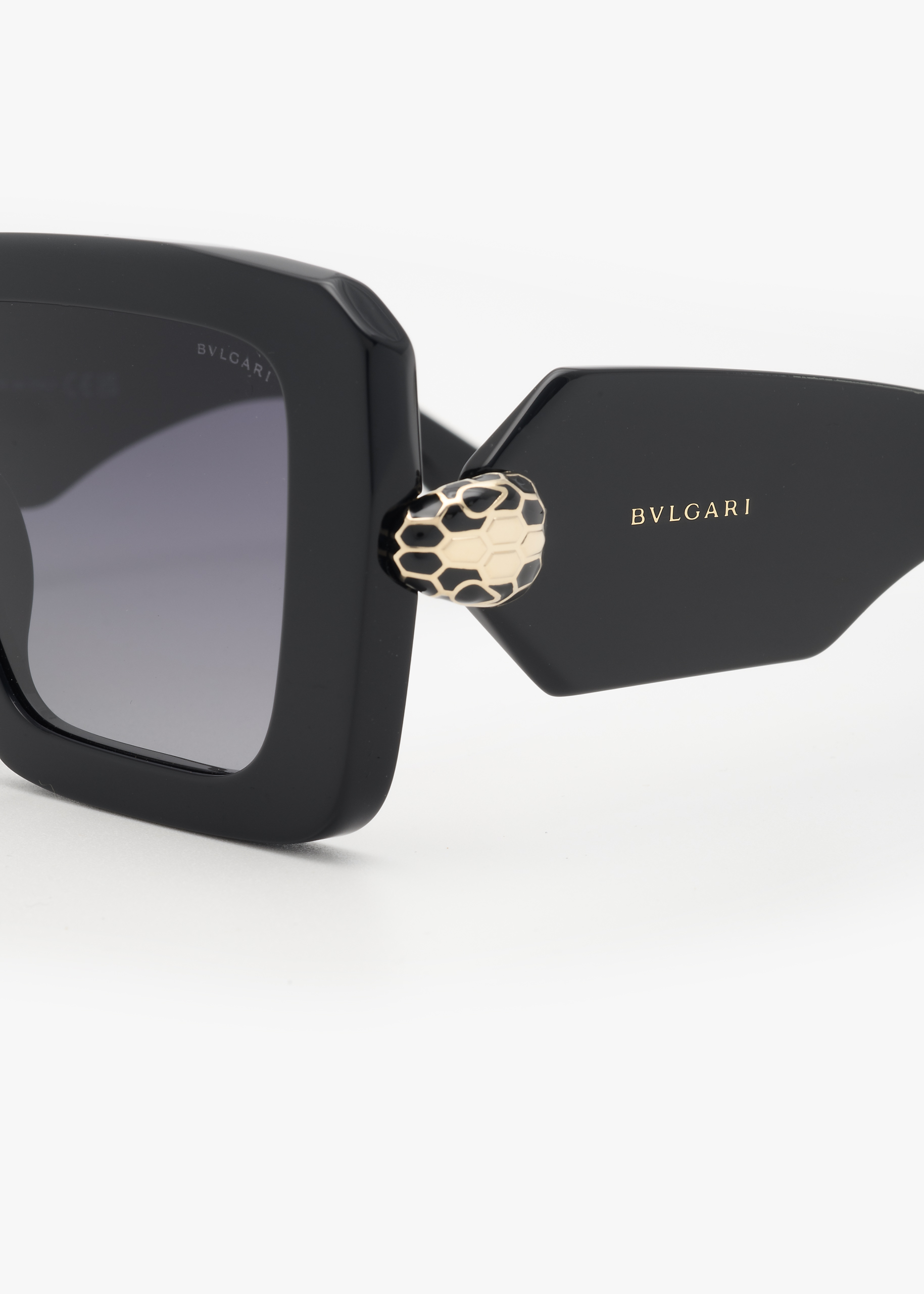 Occhiali da sole Serpenti Forever con montatura rettangolare oversize in acetato nero e lenti sfumate fumé. Ispirata all’iconica chiusura delle borse Serpenti e adornata da squame in smalto applicate a mano, la preziosa testa di serpente che arricchisce le aste dona al modello un tocco di irresistibile eleganza.