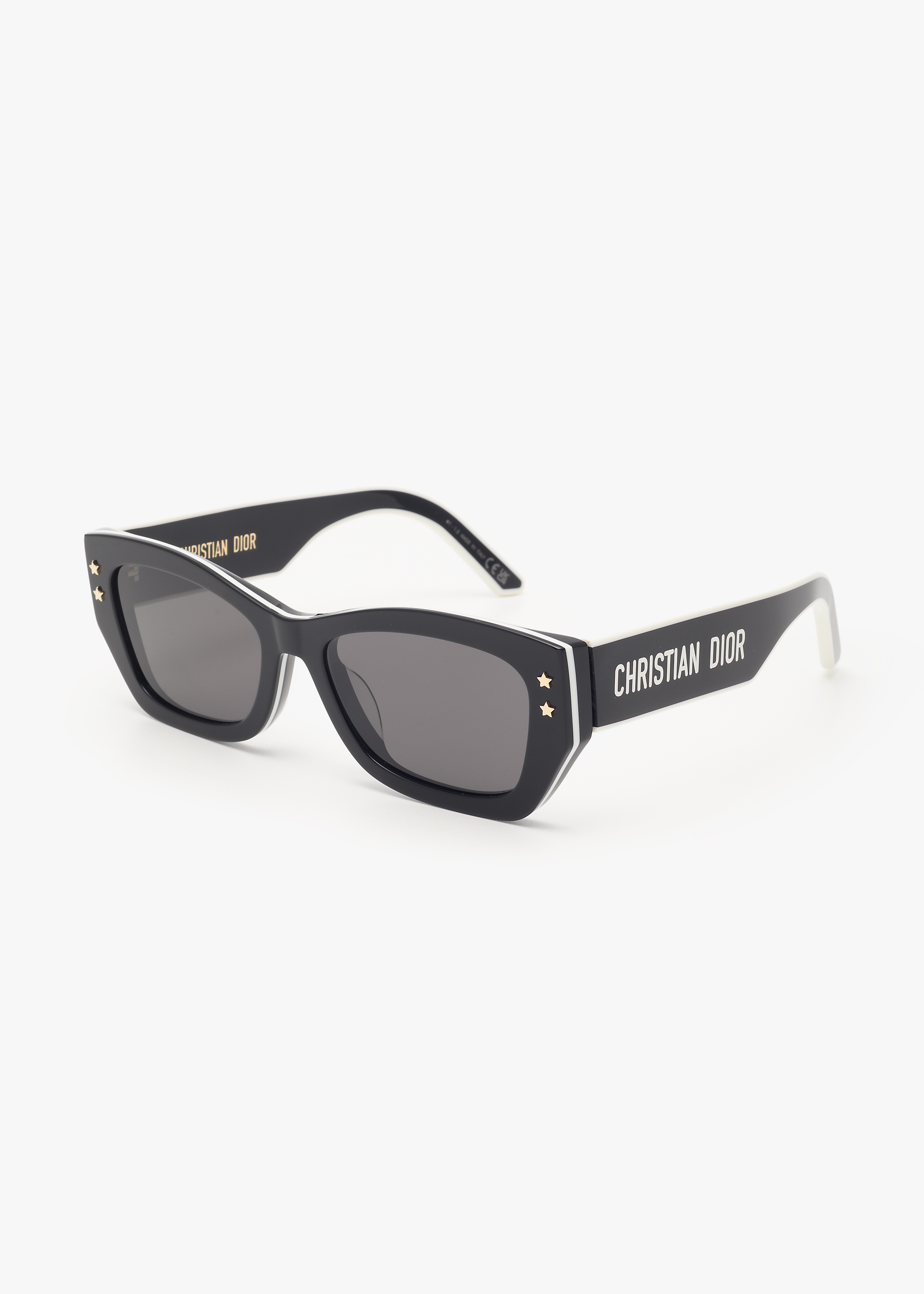 Questi occhiali da sole DiorPacific S2U presentano una forma rettangolare dallo stile audace e moderno. La montatura in acetato è adornata da un effetto a triplo strato bianco e nero con stelle color oro sul frontale, mentre le aste sono impreziosite dalla firma Christian Dior. Dotato di lenti grigie, questo nuovo modello must-have completerà ogni look con un tocco di stile esclusivo.