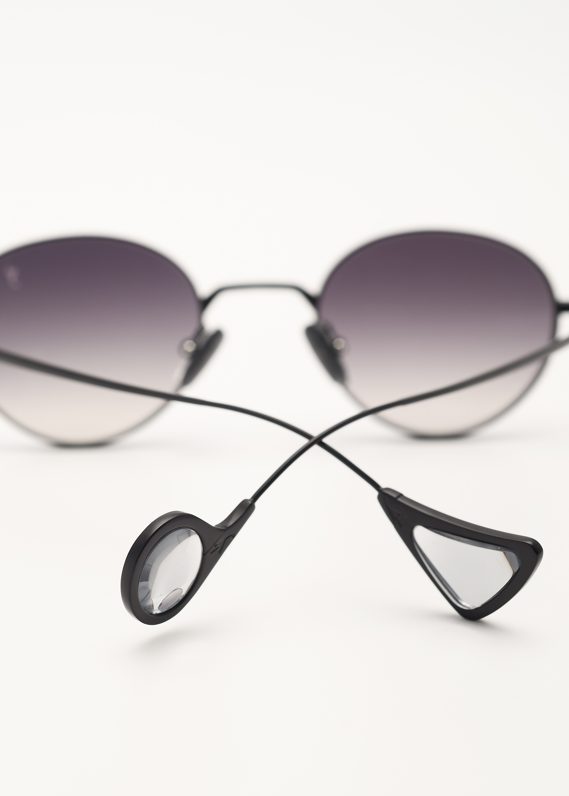 MONTATURA IN TITANIO CON LENTI DI INGRANDIMENTO SUL TERMINALE, PRODOTTO IN ITALIA.