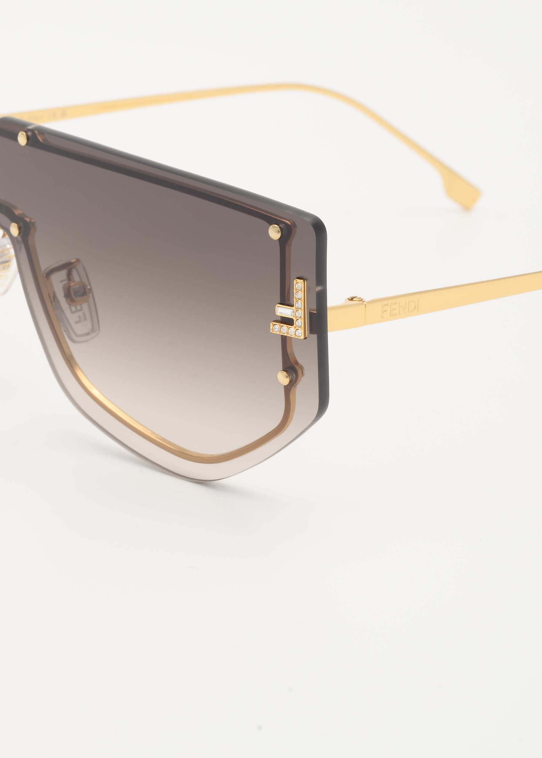 Maschera Fendi First con aste in metallo color oro e lenti kaki sfumate con micro F in cristalli. Naselli regolabili. Made in Italy.