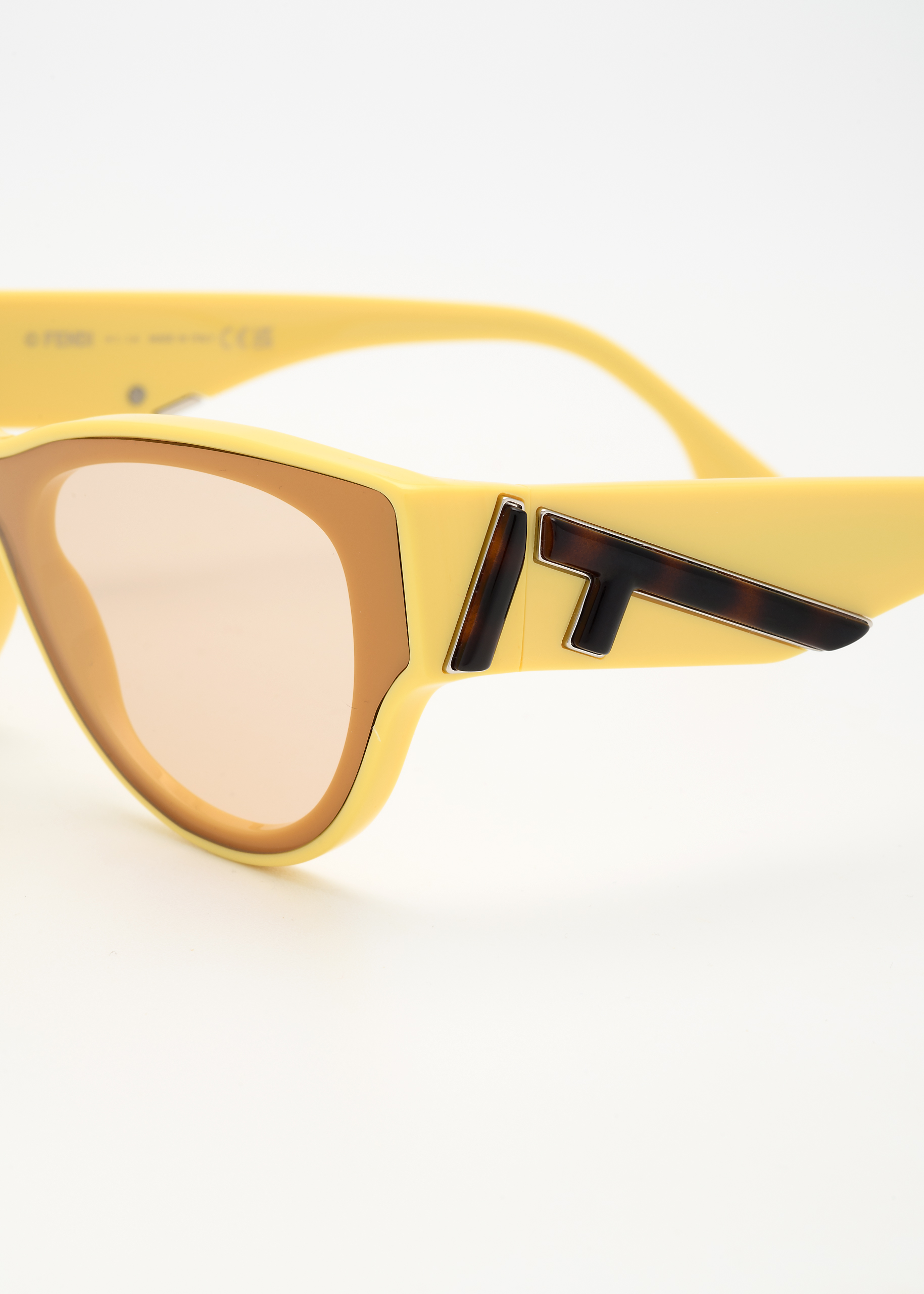 Occhiali Fendi First dalla forma cat-eye in acetato marrone chiaro lucido e struttura della lente a maschera. Aste con motivo macro F in diagonale in metallo dorato. Lenti marroni. Made in Italy.