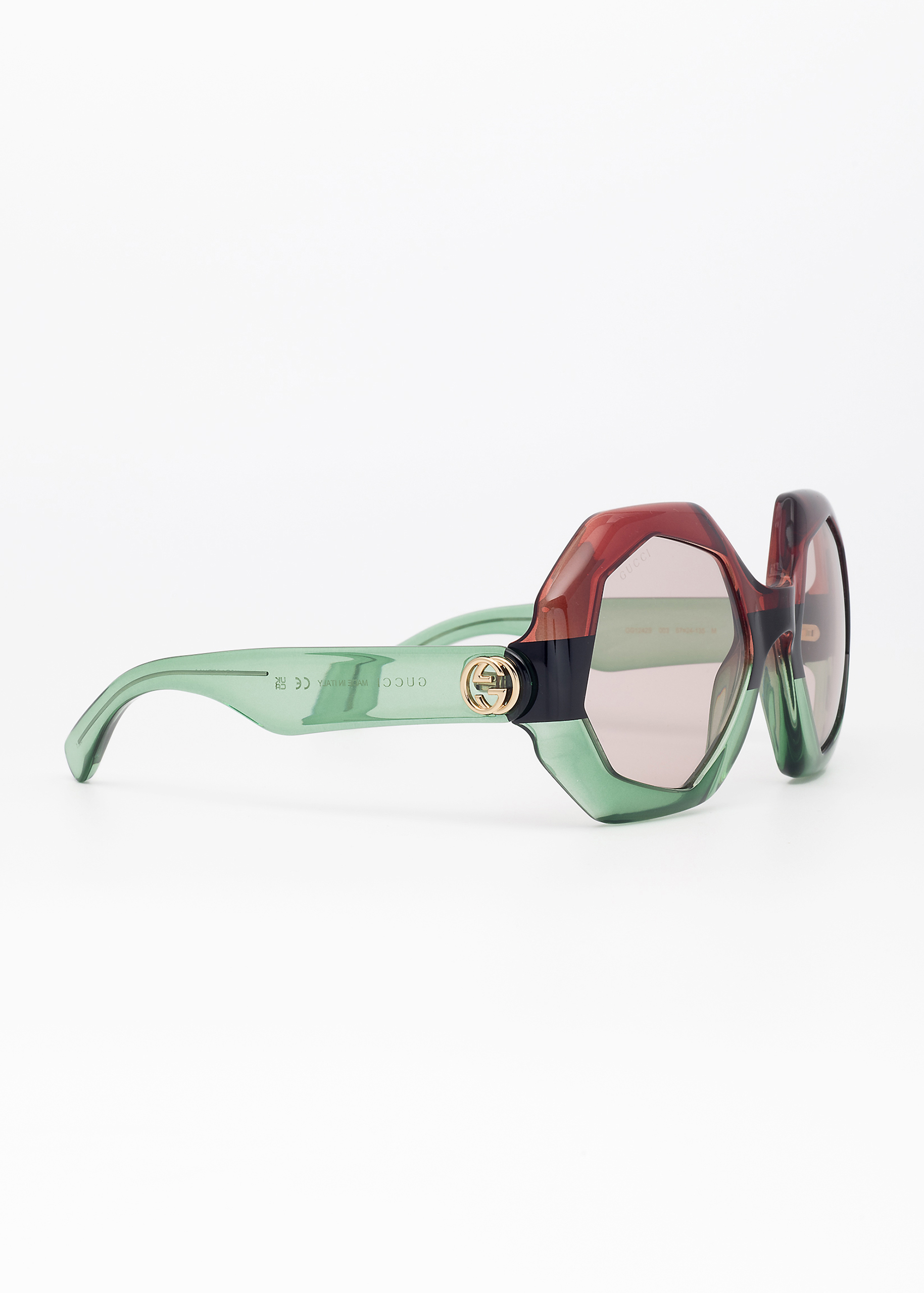 Questo modello da sole unico è caratterizzato da una costruzione sfaccettata per armonizzarne i volumi ricreando, in modo decisamente originale, l’iconico motivo Web di Gucci sul davanti attraverso 3 strati di colori in una combinazione unica. Il modello è ornato dal logo GG.