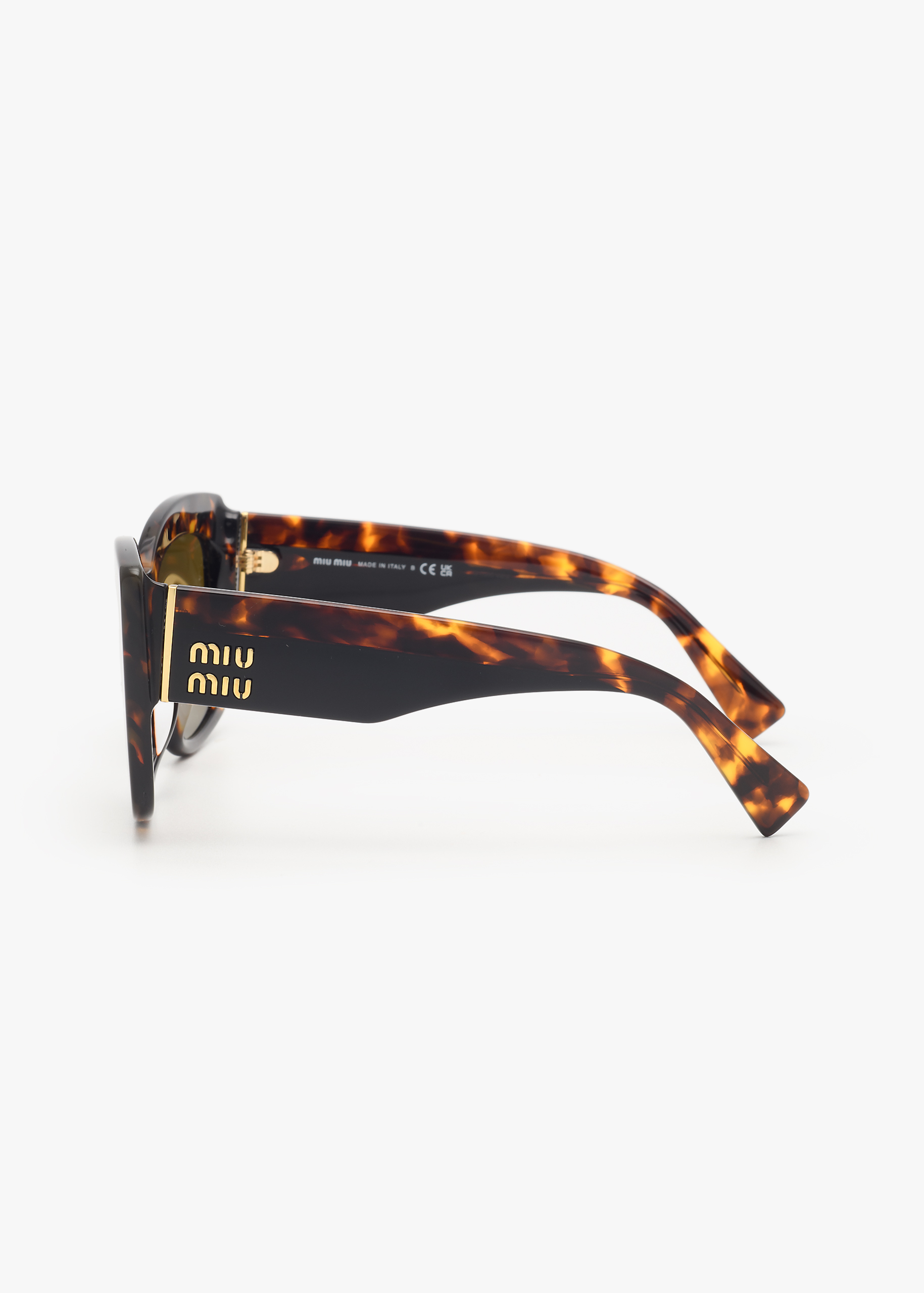 La montatura squadrata, realizzata completamente in acetato, è caratterizzata da volumi importanti che rimandano a uno stile glamour e contemporaneo. Le aste extra bold sono siglate dall’imponente logo Miu Miu a contrasto colore.