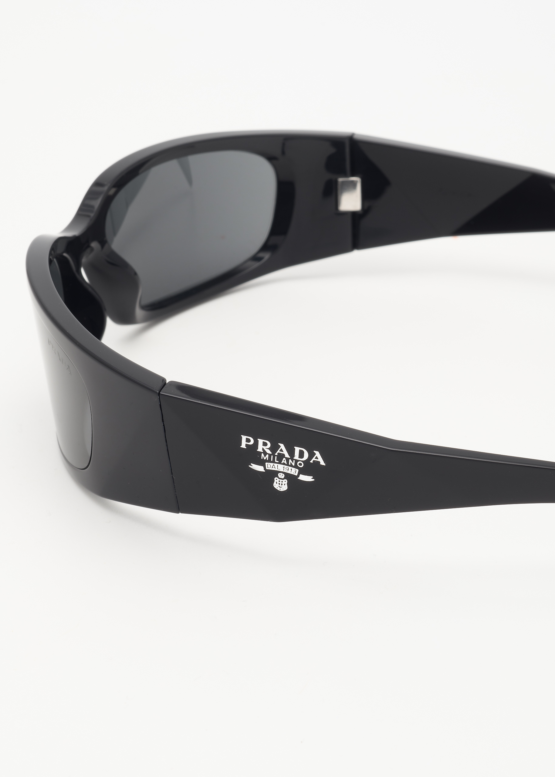 In omaggio all’iconico motivo a tre lati e al simbolo del brand, questi moderni occhiali da sole dal frontale curvilineo presentano piccole silhouette triangolari visibili lungo le aste e l’intramontabile logo Prada.