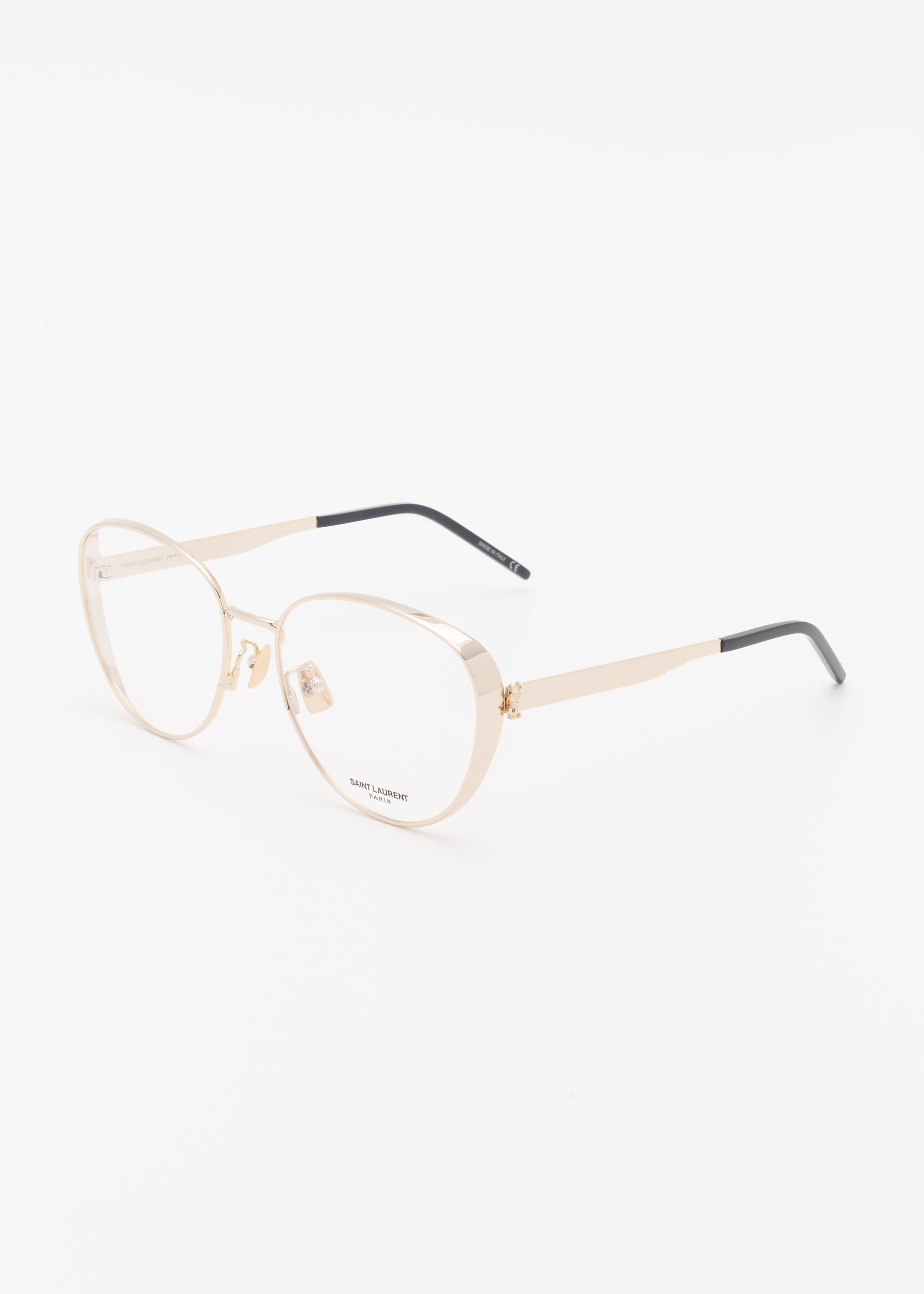 MONTATURA FEMMINILE IN METALLO DALLA FORMA ARROTONDATA, CONTRADDISTINTA DA UN DISCRETO SPOILER LATERALE E DA UNA STRUTTURA LEGGERA E SOFISTICATA IN METALLO CHE RIVISITA LA LINEA MONOGRAM. IL LOGO YSL DAI COLORI CON FINITURA GALVANICA DECORA LA PARTE FINALE DELL’ASTA, COLLEGANDOSI ALLO SPOILER LATERALE DEL FRONTALE.