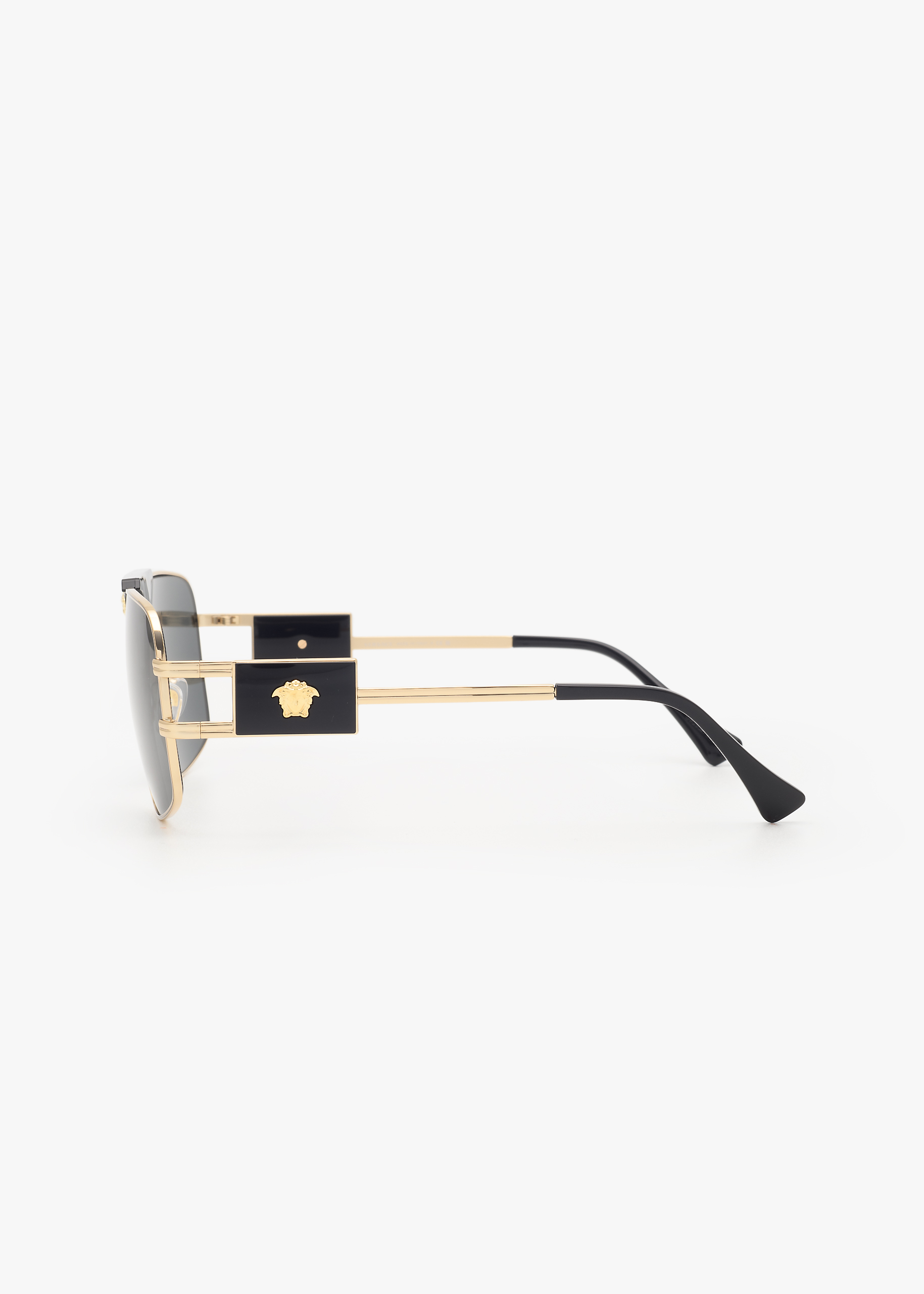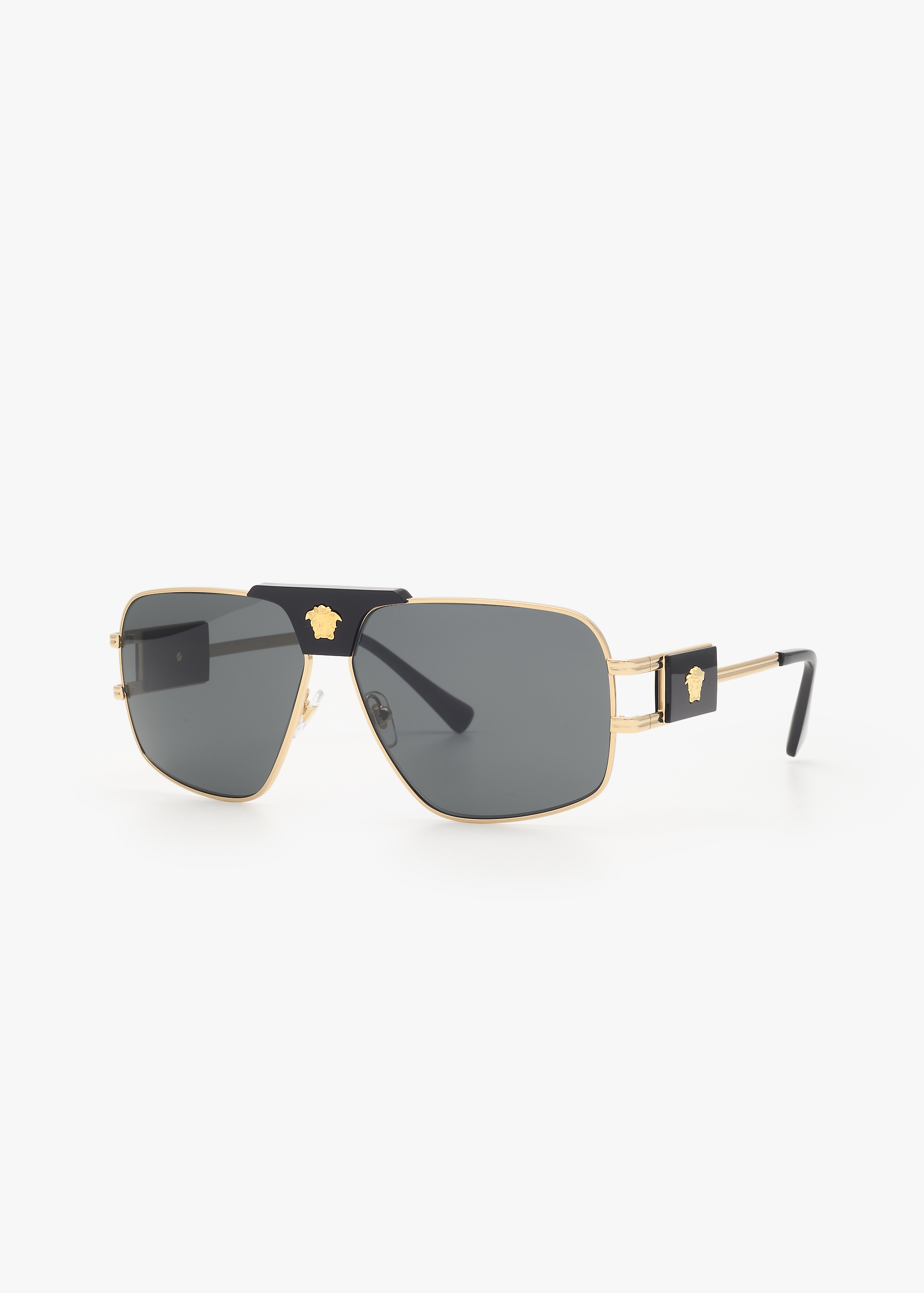 Occhiali da sole pilot geometrici caratterizzati da montature metalliche, lenti scure ed elementi in metallo Medusa.