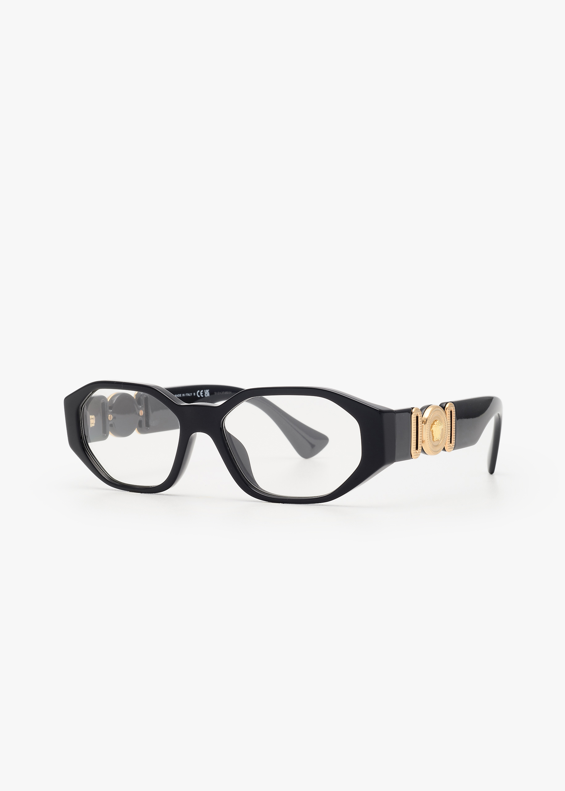 Ispirati alla cultura hip-hop degli anni ’90, questi occhiali con vetro ottico rettangolari presentano una montatura in acetato e aste ampie rifinite con dettaglio Medusa.