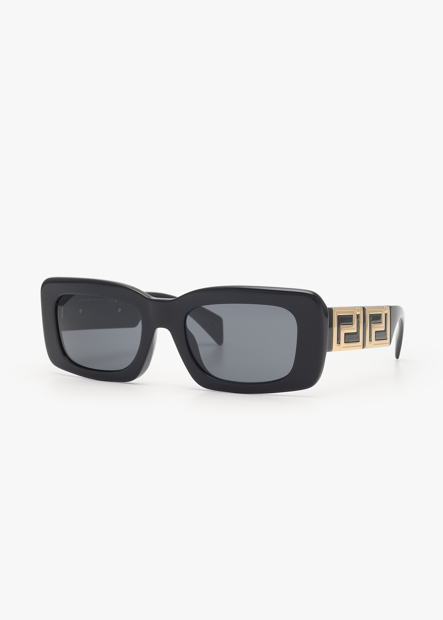 Occhiali da sole squadrati caratterizzati da montatura in acetato ed elementi in metallo traforato Greca sulle aste.