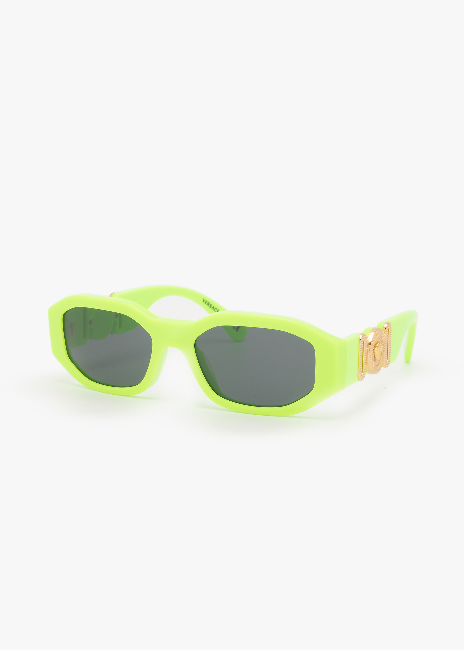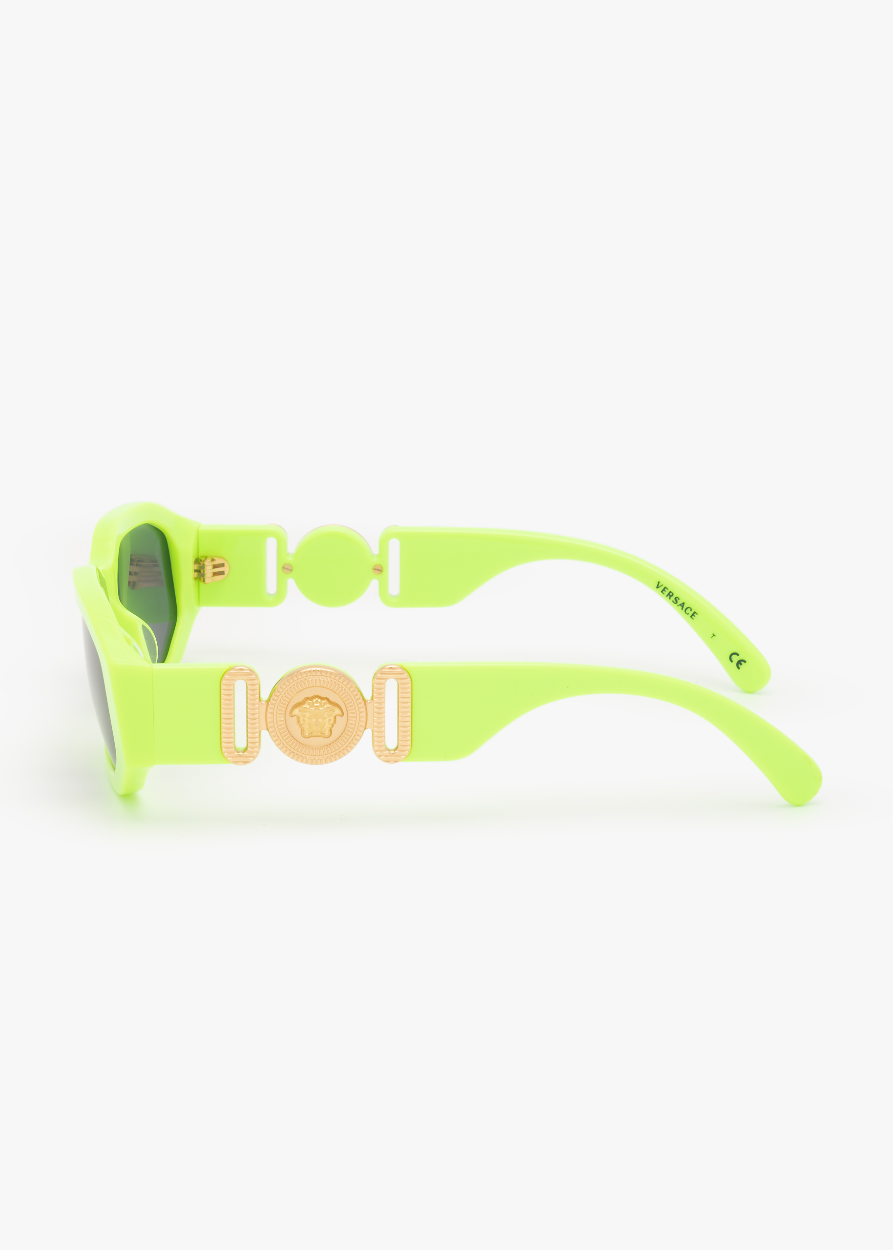 In stile mini-me, questi occhiali da sole presentano una montatura in acetato e aste ampie rifinite con dettaglio Medusa. La forma rettangolare รจ messa in risalto dalle lenti con sfumatura scura.
